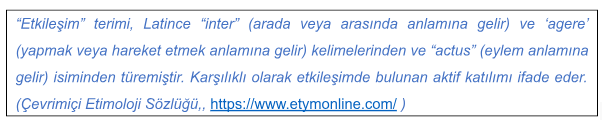 “Etkileşim” terimi, 20. yüzyılın ortalarında, özellikle bilgisayarların ve dijital medyanın ortaya çıkmasıyla birlikte yaygın olarak kullanılmaya başlandı. Bu terim, kullanıcı ile sistem, ortam veya çevre arasındaki dinamik ve karşılıklı iletişimi tanımlar.