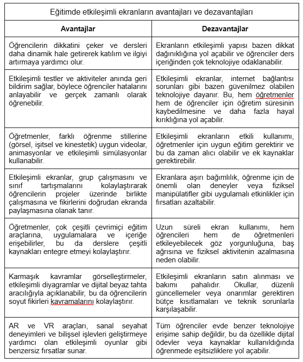 Öğretmenler, bu araçlar modern eğitimin merkezinde yer almaya başladığından, öğrencilerin öğreniminde etkileşimli ekranların avantajlarını ve risklerini net bir şekilde anlamalıdır. Bir yandan, etkileşimli ve uyarlanabilir içerik sayesinde katılımı artırmak, kişiselleştirilmiş öğrenmeyi desteklemek ve eleştirel düşünmeyi teşvik etmek için muazzam bir potansiyel sunarlar. Öte yandan, eğitimciler ekran süresi, dijital dikkat dağınıklığı ve yüzeysel katılım potansiyeli gibi endişeleri de göz önünde bulundurmalıdır.
