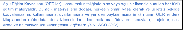 Herhangi bir ortamda, dijital veya diğer türlerde bulunan, kamu malı olan veya başkaları tarafından ücretsiz erişim, kullanım, uyarlama ve yeniden dağıtıma izin veren açık bir lisans altında yayımlanmış öğretim, öğrenim ve araştırma materyalleridir. Kaynak: DigCompEdu.