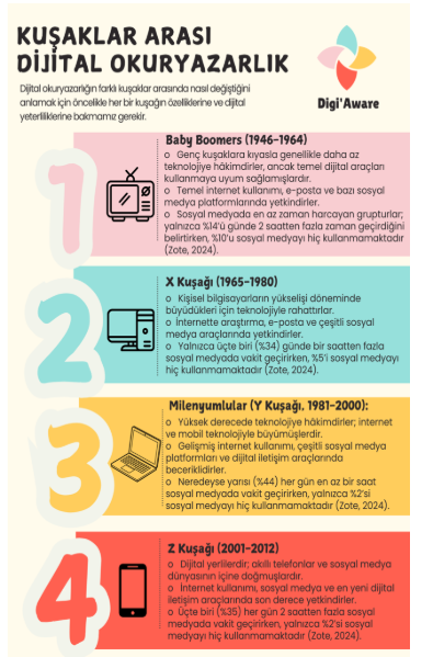 Dijital okuryazarlık, kişilerin büyüdükleri teknolojik çevreye bağlı olarak kuşaklar arasında önemli ölçüde farklılık göstermektedir. Baby Boomer’lar, daha az teknoloji meraklısı olmalarına rağmen, temel dijital araçlara uyum sağlamış ve aktif öğreniciler olarak kalmışlardır. X Kuşağı, kişisel bilgisayarların doğuşuna tanıklık etmiş, teknolojiyle rahat olan fakat genç kuşaklara kıyasla ona daha az bağımlı bireylerden oluşur. Y Kuşağı (Milenyum Kuşağı), dijital dünyaya geçiş döneminde büyümüş, çok çeşitli dijital araçlar ve sosyal medya platformlarını kullanmada oldukça yetkin hale gelmiştir. Z Kuşağı ise gerçek dijital yerliler, olarak, dijital teknolojilerde en yetkin kuşaktır ve onları yaşamlarının her alanına entegre etmişlerdir. Dijital okuryazarlıkta bu kuşaksal farklılıkları anlamak, eğitimi, iletişimi ve teknoloji tasarımını her grubun benzersiz ihtiyaç ve güçlü yönlerine göre uyarlamak açısından kritik öneme sahiptir.