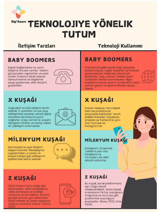 “Dijital göçmenler”olarak Baby Boomer’lar, nitelikli içeriğe ve kişisel bağlantılara öncelik verir, teknolojiyi esasen bilgi edinmek ve küresel gelişmeleri takip etmek için kullanırlar. “Hibrit” olarak tanımlanan X Kuşağı, öz ve net iletişime değer verir; teknolojiyi hem kişisel hem de profesyonel amaçlarla kullanır. Y Kuşağı, yaşam memnuniyetine ve açık iletişime öncelik verir; sosyal medyayı bağlantı kurmak, eğlenmek ve içerik paylaşmak için kullanır. Gerçek “dijital yerliler” olan Z Kuşağı ise dijital iletişimi hayatlarına entegre etmiş, anlık geri bildirim ve kişisel marka oluşturma amacıyla çok çeşitli platformları etkin şekilde kullanmaktadır.