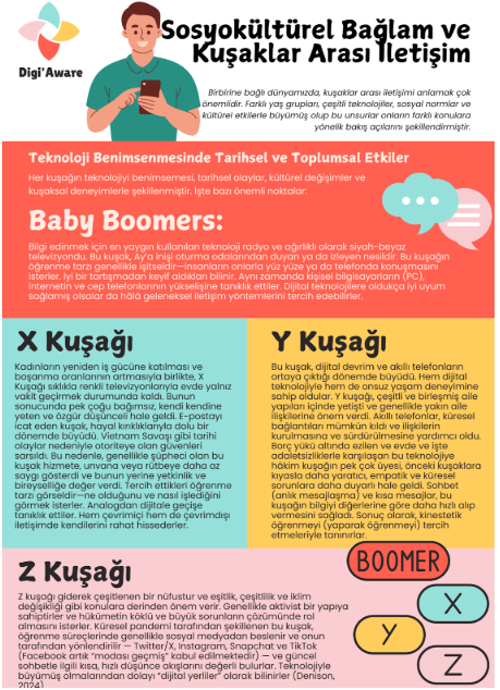 Teknolojinin yaşamlarımız üzerindeki etkisi, dijital beceriler geliştirmenin dijital dünyada etkili şekilde yol almak için ne kadar önemli olduğunu göstermektedir. Bu modül, farklı kuşakların teknolojiye yaklaşımını ve kullanım biçimlerini vurgulayarak onların dijital yetkinliklerini ve iletişim tercihlerini ortaya koymaktadır.